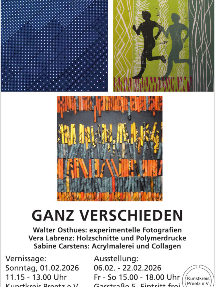 Der Kunstkreis Preetz widmet sich der Förderung moderner bildender Kunst in Preetz und Umgebung. Mit Leidenschaft für kreative Ausdrucksformen bieten wir Künstler:innen eine Plattform, um ihre Werke einem breiten Publikum zugänglich zu machen. In unseren regelmäßig wechselnden Ausstellungen im Haus Meckelnburg zeigen wir die Vielfalt und Qualität zeitgenössischen Kunstschaffens – von Malerei über Grafik bis hin zu installativen Arbeiten.
